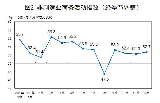 12月份,非制造業商務活動指數為52.7%,比上月上升0.4個百分點,高于臨界點,非制造業恢復步伐加快。