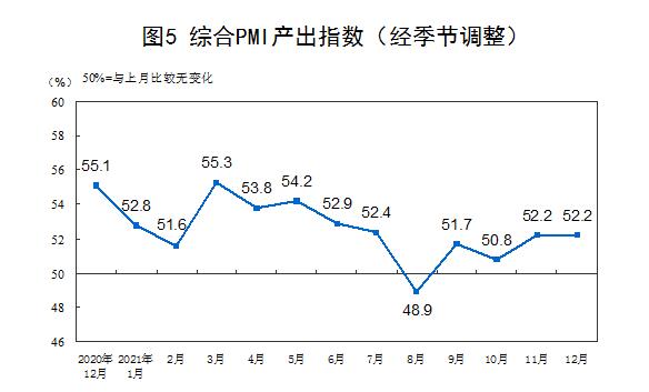 12月份,綜合PMI產出指數為52.2%,與上月持平,表明我國企業生產經營活動總體穩定擴張。